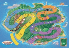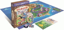 The playing board represent the entire island of Hawaii where you will travel throughout 5 different colored areas that are tropical environments; The main street in Lilo's town, Gantu's ship sits ominously at the base of a waterfall, a dramatic waterfall surrounded by lush foliage, a rugged cliff overlooking a beautiful white sand beach and a popular rentals location for island adventurers.