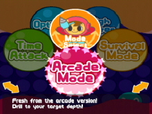 The main menu is quite simple and easy to choose from Arcade, Survival and Time Attack mode. Arcade is the main mode where you choose to drill your way to 2500 feet or to 5000 feet. Beside the main goal to react either level you must look for Air Capsule along your way in order to survive that long. You also need to be careful where you drill because blocks might fall on your head. If you can put together 4 block the same color they will disappear and it might create a chain reaction depending on witch blocks fall where. The x-Block must be avoided if possible because they will take air away from you.
