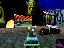 Race into the "Carnival"world When you create your own car you are able to choose the size, style, paint, weapon and the battle cry. 16 pick-ups and weapon are available in this new version on the different levels and places. Also more then 20 characters and vehicles were introduced like Roach Coach. 8 twisted world for you to explore; construction Yard, Neon City, Road Rage, Sweet Tooth's Bedroom, Amazonia 3000 B.C. , The Oil Rig, The Carnival and the Maze. Each world has a secret weapon for you to find. All these world are unique and design with their own style to give you an unique feelings in each one them. All the 13 other vehicles has their own strength and combo attack. The in-game music was provided by Rob Zombie and others to plunge you into an heavy atmosphere. Twisted Metal 4 has a in depth gameplay, enhanced graphics and more features that will surely please the fans of this successful franchise. |