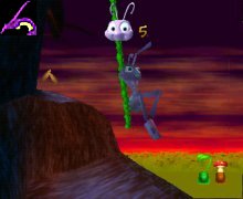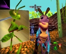 the film. Every year, the ants collect food for the winter and give some to the grasshoppers. But one year, Flik, a young inventive and courageous ant, decides to invent a machine to collect food but it becomes out of control and destroys the part of food of the grasshoppers. They became very annoyed and ask double of food. Flik decides then, with the permission of the queen who is happy to see him leaving, to go to seek larger insects to defend them of the mad grasshoppers. This game is much like Buck Bumble visually but this time you are an ant and you can't fly. You must walk in a 3D world where a lot of insects to hurt you. In each level, there are seeds which you must collect as well as 4 letters of your name which give you an extra life. Your main weapon is berries and you can make them stronger by finding items. You can run, walk, glide and jump. You must defend yourselves against all kinds of insects like mosquitos, worms and bees. Your friends can help you sometimes in certains levels.