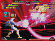 Capcom brings a nice treat for their fighting fans, Marvel vs. Capcom 2. It is a 3 on 3 tag team battle that combines 56 of all their favorite heroes of the Capcom family. When you start the game right away you will get exited and feel that you can wait to play this one because the menu is done in 3D with nice bright colors that breaths high quality graphics. Their you can select the Arcade, vs, training and score attack mode. The Score Attack mode is where you can challenge your own score. The Arcade is the main mode where you select 3 fighters and the Assist type. In the options you can select 8 levels of difficulty, 4 levels of damage and set the speed to free, Turbo or Turbo 2.