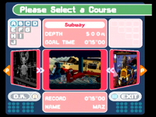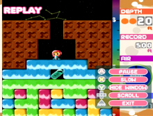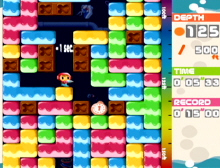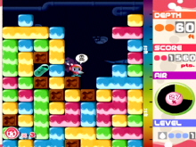 Arcade is the main mode where you choose to drill your way to 2500 feet or to 5000 feet. Beside the main goal to react either level you must look for Air Capsule along your way in order to survive that long. You also need to be careful where you drill because blocks might fall on your head. If you can put together 4 block the same color they will disappear and it might create a chain reaction depending on witch blocks fall where. The x-Block must be avoided if possible because they will take air away from you. Time Attack is where you run against the clock where instead of looking for air to survive you look for clock through out the levels.