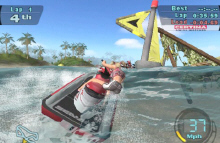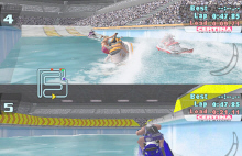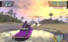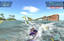 ![]() There is also a multiplayer section where you can play with a friend. Unfortunately you can not play 4 players. There are different ways to view your race but there is no first person view. It would of been fun when you submarine your Sea-Doo to be able to see under the water the marine life. Splashdown is quite fun the play because it is full of actions and the courses are designed to keep your interest at all time plus if you look carefully they have hidden passages for you to experience.