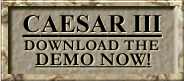 Features Sierra Studios and Impressions are proud to announce the fall 1998 release of Caesar III. Drawing on the success of the award-winning Caesar II, which sold over 500,000 units, Caesar III is a strategic simulation offering players the opportunity to create, rule and defend a Roman-era city of their own design. Players of Caesar III are immersed in a city simulation set in the age of the ancient Roman Empire. Players place buildings on previously empty terrain and construct a city. These buildings come to life, and the city begins to evolve. As the city grows, it encounters various problems which must be overcome. Players have specific objectives to achieve, although many players will not use these, but rather will content themselves in designing their idea of the perfect city. The game is structured as a career, beginning with a training mission, and then progressing through a series of ever tougher real assignments. Each mission/assignment consists of a province and set objectives. Achieving these objectives will result in promotion and an offer of a tougher assignment, which can be turned down if the player is having too much fun to accept at that time. he career progression allows us to introduce elements of the game step by step, thereby teaching players how to play without forcing them to play through something called a tutorial. This technique has been extremely well-used in games such as Warcraft. There will also be a "City Construction Kit" option, where players ignore the career progression, and simply play the full game with no promotion involved. System Requirement * Pentium 90 |