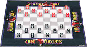a three dimensional, six level game. CUBE CHECKERS adds a roll-over move which increases the power of a cube checker at a moment's notice. This allows a player to use and develop his or her creative abilities instead of memorizing repetitive playing patterns. What makes CUBE CHECKERS so special? Instead of the repetition of playing patterns and moves, CUBE CHECKERS introduces two changes that drastically increase the menu of strategic choices. First, the traditional checkers' game piece has been exchanged for a cube with one through six labeled on the sides. Second, players are allowed two moves on each turn--the first move consists of the regular checkers' move and the second move allows the player to roll a cube over to the next highest number. Thus, players can protect their cube from a jump by simply rolling over to a higher number than the attacking cube. When a cube reaches the maximum number of six by performing the roll-over or is moved to the end row of the opponent, it becomes a king. By introducing the rollover move to traditional checkers it sends checkers to... THE CUBE DIMENSION!