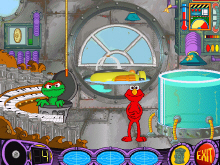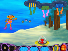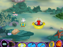 Not only Elmo will be with you through out the entire adventure but you will also help characters like Oscar, Rosita, Zoe and Grover. You start the game in the Oscar's Undewater lab where he asked you to help find ocean debris like jewelry, coins, bottles and plates. then you must bring it back to him. During your exploration Elmo is in the submarine and talks to you. Three tools are available for you to use the minin sud where you pick up items with or you can tickles animals in the sea with the hand, the flashlight where you can see better in the dark deep cave and a microphone where you can listen to anything that bubbles, hear the sound of a partiuylar animal does or even have animals like an octopus talk to you. You can park you submarine on underwater trash can and play activities during your exploration like matching the same animals together or reconizing specific sounds. In The Clan of Cave Pairs, Rosita will have you matched different creature together.
