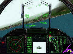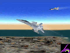 "Pulling high G's!" see you coming and will see you too late to react,Boom! Deadly surprise.But be ready for enemy jet fighter to intercept you because this game is pure dogfight action and Microprose made it intense and fun. The lack of the enemy artificial intelligence is not the major problem in this game,but the missions objectives are not complex and the avionics are so simple that only from two clicks of a button you finish the mission and move to the next mission briefing.The game also lack of realistic.The missiles are easy to avoid only by turning a small 30 degress in a direction and expand some flares and chaffs.The details are not very precise and weather condition are poor. The visual effects are quit simple but still make you feel like you are in the cockpit.The landscape, the missiles trails and the explosions are very well done.You can have the sensation that the missile you just launched was a real one.The game is more based on instant action.When you climb into your cockpit and you take off,action start right there.In Top Gun you will not find yourself spend many hours just to follow waypoints like many other flight sims and risk to loose fuel and crash. Top Gun: Hornets Nest is an arcade game more than a realistic flight simulator.It is a game made to get fast and fun action in those marvellous jet fighter and try to become the next Top Gun legend from the U.S. Navy. |