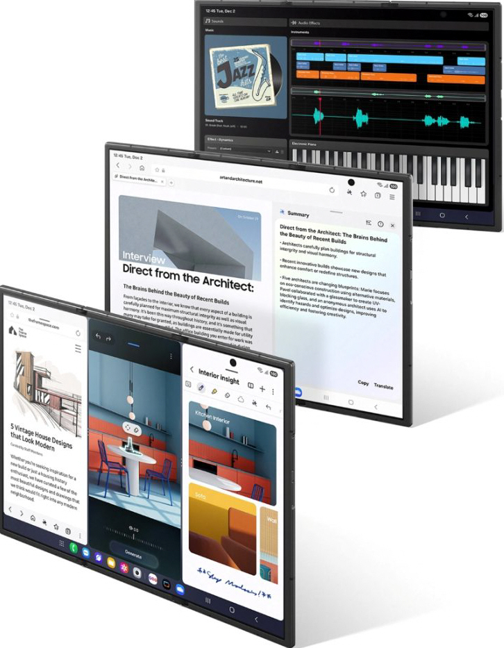 To balance the power of an ultra-quality device in a thin, portable frame, a re-optimization of the core foldable technology had been applied. Every part of the device was crafted with deep attention to structural innovation and product assurance: Samsungs Most Advanced Hinges Yet: Drawing on its heritage in foldable phone innovation, Samsung refined the Armor FlexHinge to meet the unique demands of Galaxy Z TriFold. Two differently sized hinges with a dual-rail structure work in harmony, creating a smoother, more stable fold despite varying weight and components across the device. The hinge structure also allows the screen panels to meet securely with a minimal gap, enabling a thinner, more portable device. Restructured Foldable Display: Galaxy Z TriFold introduces new display technology made for the 10-inch screen that folds twice into a pocketable phone. A reinforced overcoat has been added to a shock-absorbing display layer for better resistance across the dual-folding device. Advanced Materials on the Exterior: The titanium hinge housing introduces a thin piece of metal that protects the folding mechanism and resists wear over time. The frame of the device is supported by Advanced Armor Aluminum, a high-strength alloy that adds rigidity without increasing bulk. The frame helps ensure that the screens dont make contact with each other, and a ceramic-glass fiber-reinforced polymer back panel keeps the design thin yet resistant to cracks. High-Quality Inspection, on Each Device: Every unit goes through a series of strict quality checks to achieve every small requirement. For instance, CT scanning of the flexible printed circuit board verifies that it has been correctly manufactured according to the design, ensuring accuracy and reliability before bonding it together with the other internal display components. Laser scanning verifies that all internal components are mounted precisely at their intended height, securing surface quality. Through design innovation, engineering excellence and high-quality standards, every device has been built to deliver the best user experience possible. Samsungs Most Versatile AI Phone, Powered by the Largest Screen Productivity on Galaxy Z TriFold is heightened with powerful experiences, customized for the 10-inch display the largest screen ever on a Galaxy phone. Like the users who inspired its dynamic design, Galaxy Z TriFold is powerful, versatile and ready for the modern AI era. When Galaxy Z TriFold opens, the screen performs similarly to three 6.5-inch smartphones across the 10-inch display, giving users more room to multitask during their day. Users can use the screen with endless versatility they can create across three different portrait-sized apps side-by-side without interruption, resize apps in multi-window to view the most important information clearly, or hold it in a vertical orientation when reviewing documents for improved focus. For example, an architect drafting design plans for a new home can use the large screen to operate three applications at the same time, to review blueprints, write a proposal, and calculate measurements in a single, multi-window workspace. If a call comes in unexpectedly, they can answer without disrupting their layout or losing their momentum. When its time to jump back into work, the Taskbar at the bottom right of the display instantly resurfaces recently used apps, bringing the full setup back into view with a single tap. Familiar apps and features, such as My Files and Samsung Health have also been optimized for a large screen, allowing users to organize and understand insights at a glance.