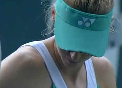 Through out the Tournament Elena only got broken once now facing 3 break points a beautiful drop shot brings it to 15-30, now 30-40 little rain still falling excellent forehand winner on the line brings it to a deuce, again an excellent forehand winner on the line to give the advantage to Elena and a ball in the net gives the game to Elena. Now Elena is asking for a stop because to o much rain is falling. The empire is now getting down and examines the court. Elena looses her serve to start the second set but gets back on track now it is 3-2. Now 4-3, 15-40 on Sybille serve the rain start pouring now in a major rain delay.