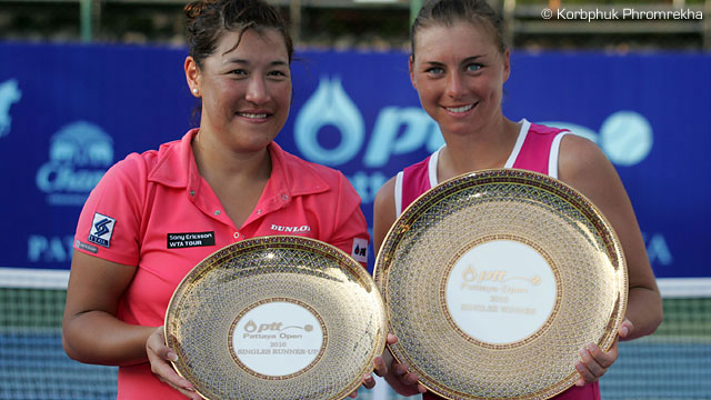 Vera Zvonareva wins the PTT Pattaya Open for the second year in a row, capturing her 10th Sony Ericsson WTA Tour singles, against Thai tennis icon Tamarine Tanasugarn. 64, 6-4. "I'd like to congratulate Tammy for coming back here and playing so well this week. The Thai people are so proud of her," Zvonareva said. "For me, I'm very happy to come back and defend my title this year. I also hope to come to Pattaya next year. Thanks to all of the sponsors and Mr. Geoffrey Rowe, the Tournament Director, for making the tournament such a success." "Thank you very much to all the fans here - especially the Thai fans - for cheering me on during the week. Also thanks to the Russian fans for cheering Vera on, she played so well today," Tanasugarn said. "Thanks to all the sponsors who host this tournament every year and give me a chance to play here. I'll try to play my best with my partner in the doubles final now!" Zvonareva is almost on par in career finals now, going 10-11. She has won her last three finals since finishing runner-up at the season-ending Sony Ericsson Championships in 2008 - she won here and Indian Wells last year, and now here again this year. It was also Zvonareva's second successful title defense, having won back-to-back Memphis crowns back in 2004 and 2005. Tanasugarn fell to 3-7 in career finals, but the 32-year-old Thai still salvaged a trophy - she and Marina Erakovic captured the doubles title with a 75 61 win over Anna Chakvetadze and Ksenia Pervak. Tanasugarn won the doubles title here last year with Shvedova - now she and Erakovic win for the first time. Tanasugarn now has seven Tour doubles titles while Erakovic has four.